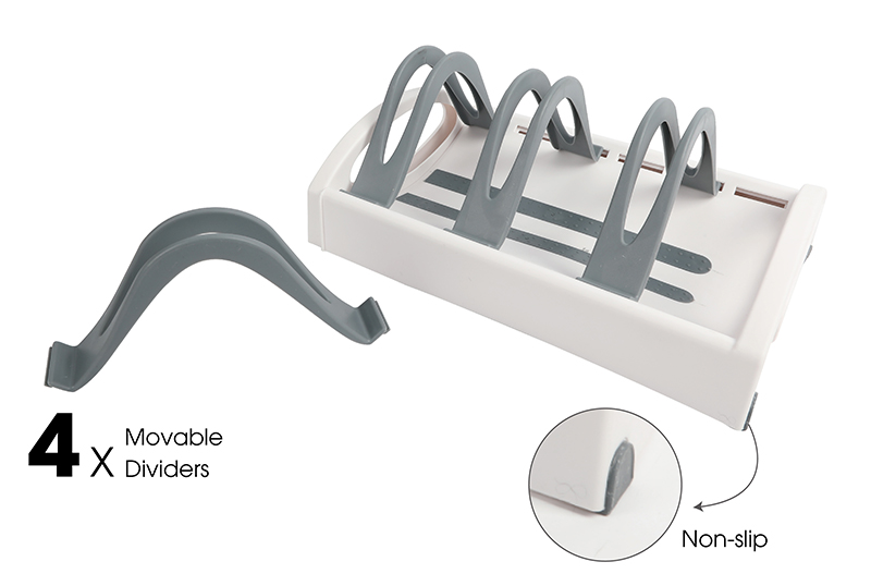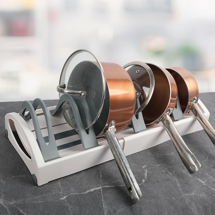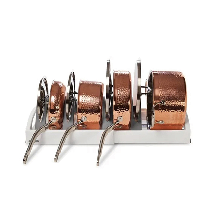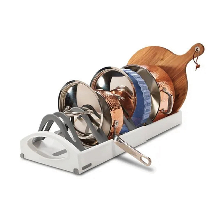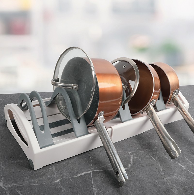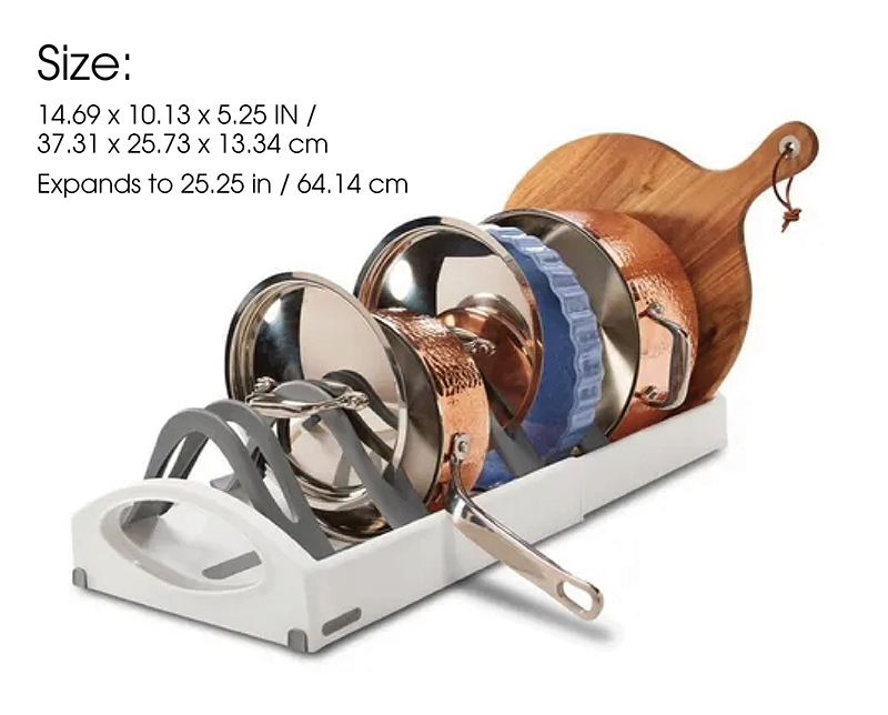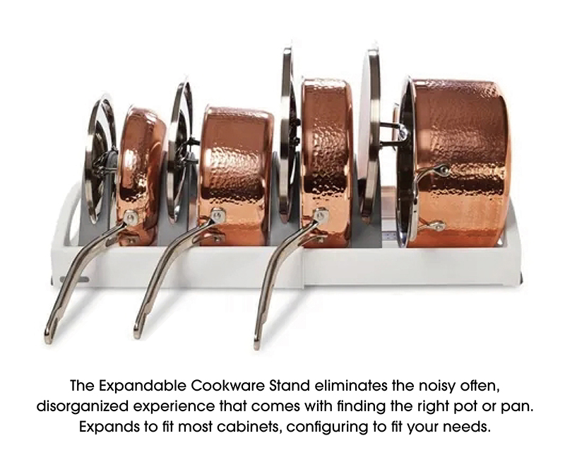 • Expandable cookware stand for organizing pots, pans, and lids